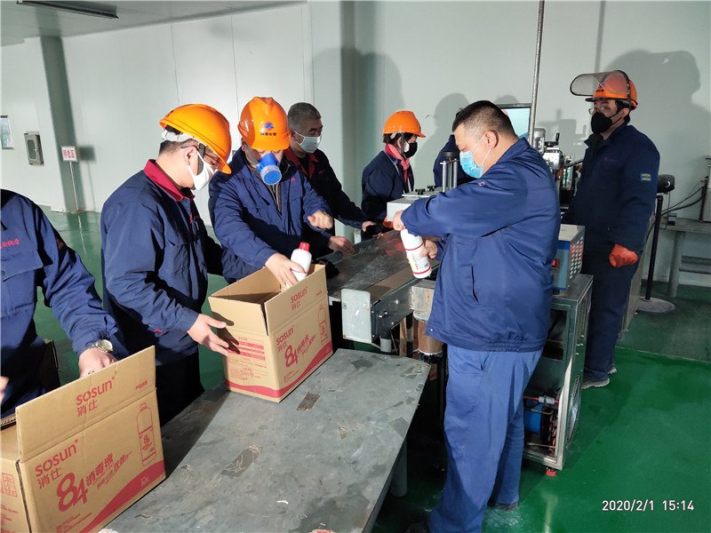 公司黨員突擊隊在84消毒液生產現(xiàn)場