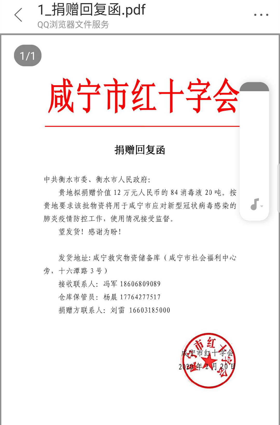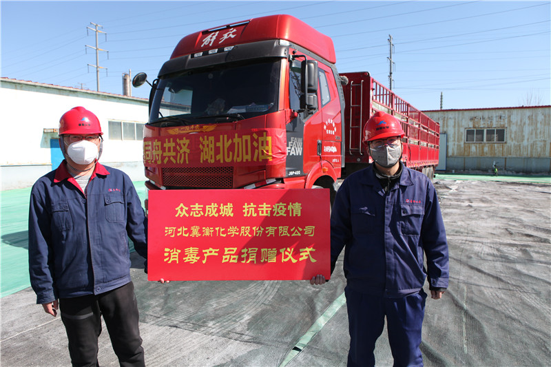 2月22號,衡水市捐贈湖北省咸寧市的20噸價值12萬元的84消毒液,在我公司緊急生產(chǎn)完成并裝車,帶著衡水人民對湖北人民的深情厚誼,啟程奔赴湖北省咸寧市,由咸寧市紅十字會接收,助力當(dāng)?shù)氐囊咔榉揽毓ぷ鳌?/div>