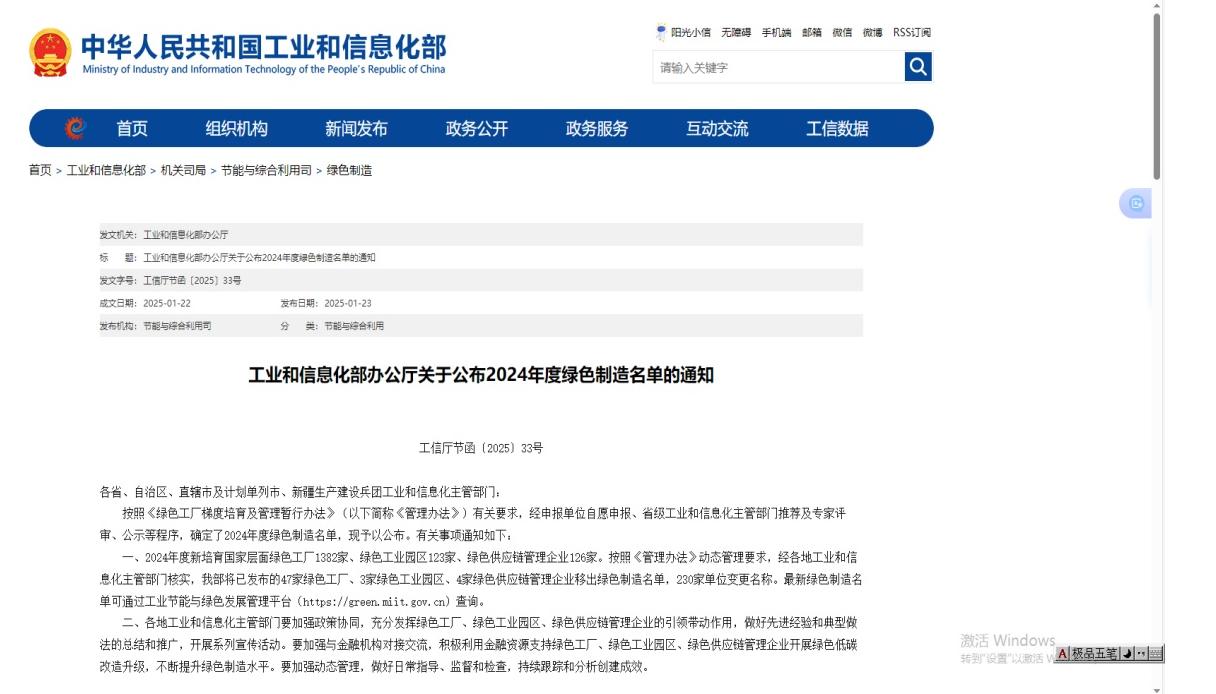 近日,工業(yè)和信息化部公布2024年度綠色制造名單,河北冀衡化學股份有限公司獲評國家級“綠色工廠”。